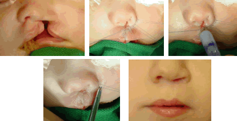 - The lip repair. There have been some relatively new studies that have raised questions about the effects of anesthesia on the developing brain (see the SmartTots website). Based on these concerns, we now delay the primary lip repair until over 6 months of age. Unlike with most other teams, at our center this operation is done as a day surgery meaning that there is no need to spend the night in the hospital. During surgery the top skin layer of the upper lip is closed with a medical grade glue, instead of using stitches (see Figures below). We were the first to describe this special technique for closing clefts and we are convinced that this type of closure results in a much better scar than when skin stitches are used (see reference #32). During the lip repair, the nose is also rebalanced using a technique that minimizes internal scarring. After the operation babies are allowed to feed with a nipple, exactly the same way as they did prior to the operation, without any restrictions. We also do not require that babies wear “no-no’s,” which we believe only frustrate children without adding any benefit whatsoever.