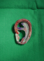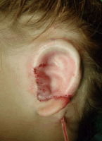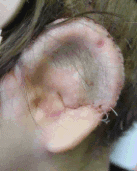 The first stage ear reconstruction is shown above. Cartilage is taken from the child's rib (parents cannot donate their rib cartilage) and this cartilage is carved and assembled to create the ear. It is then inserted under the skin. Two additional stages are required to complete the reconstruction; both performed as outpatient procedures. Children with TCS are more likely to require hair removal, as can be seen below, in a child who has just finished the second stage procedure. The third stage will involve making a hole that looks like an ear canal.